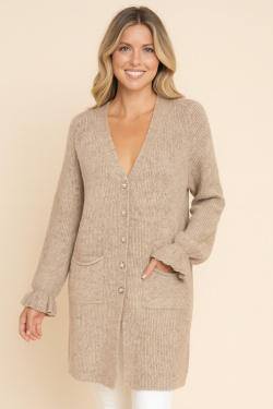 Puolipituinen neuletakki, röyhelöhihat. Ruusunmuotoiset napit. Yksi koko, sopii kokoon 38/42. Materiaali: Akryyli (65 %), villa (20 %), nailon (10 %), elastaani (5 %) Mallisto: Syksy/talvi 2025/2026 Valmistusmaa: Italia