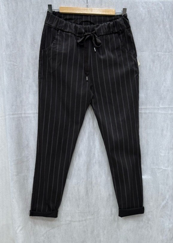 Syksyiset raidalliset housut joustavasta puuvillasta, suunniteltu Italiassa optimaalista sesonginmukaisuutta varten.
