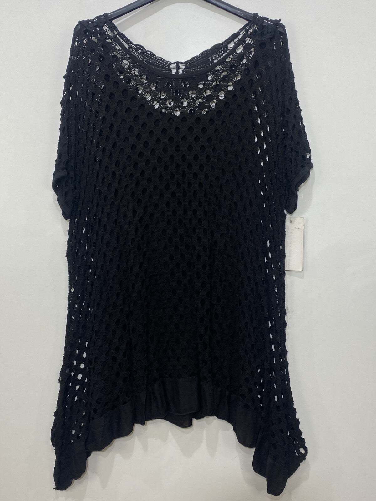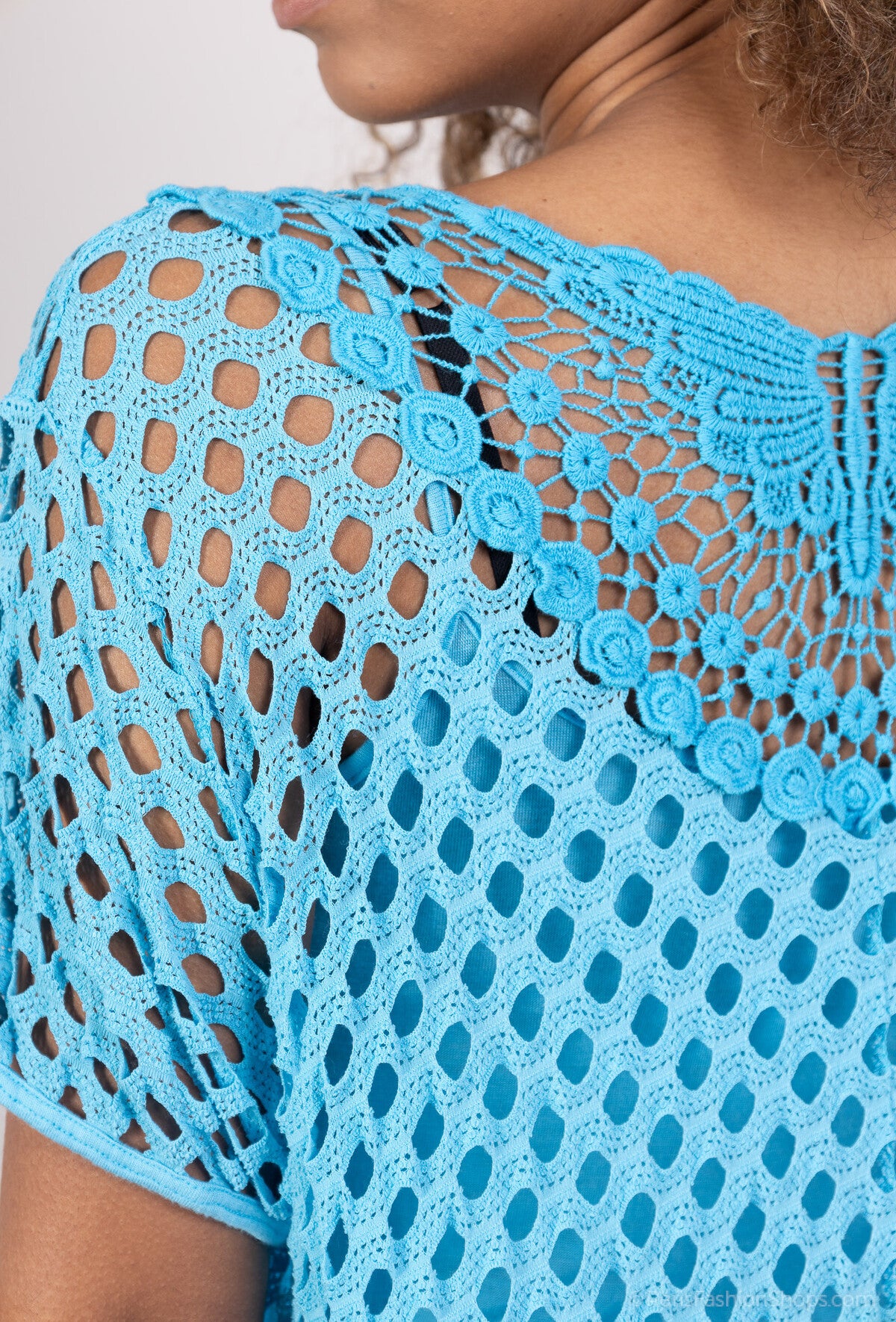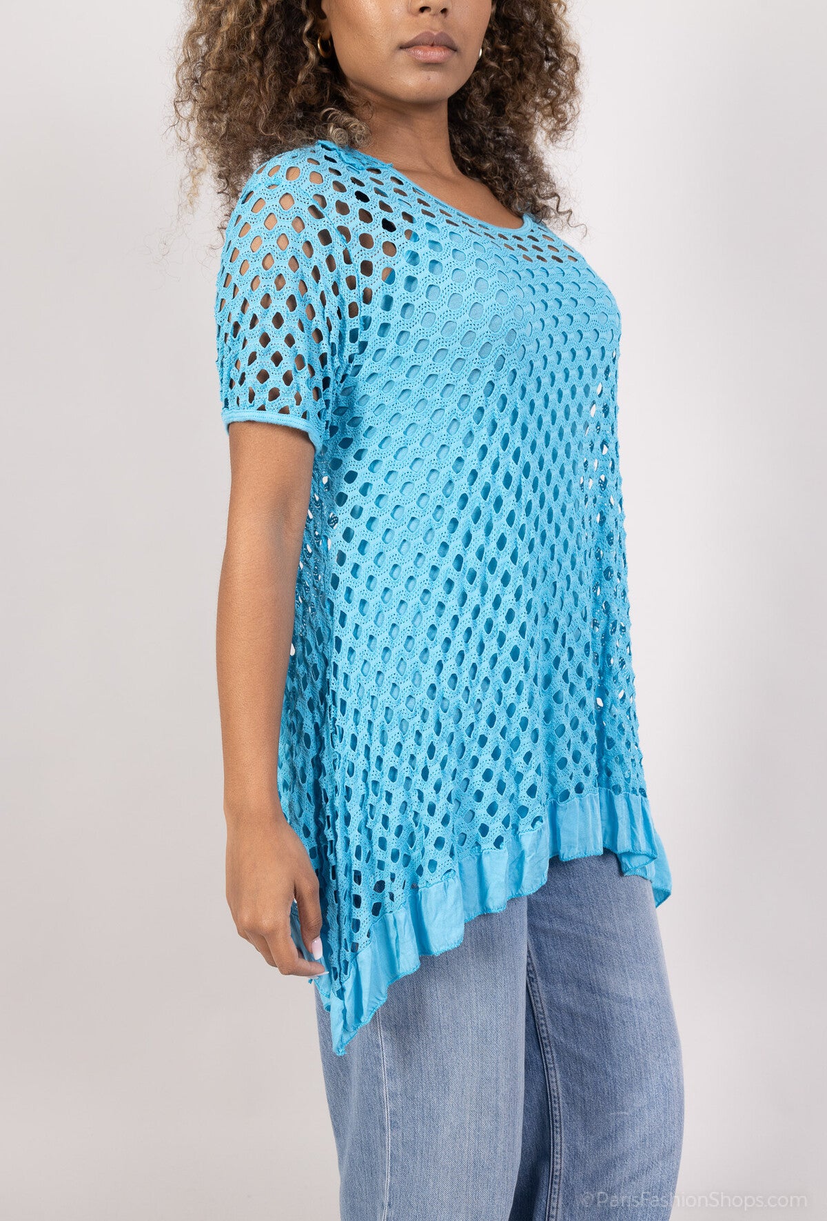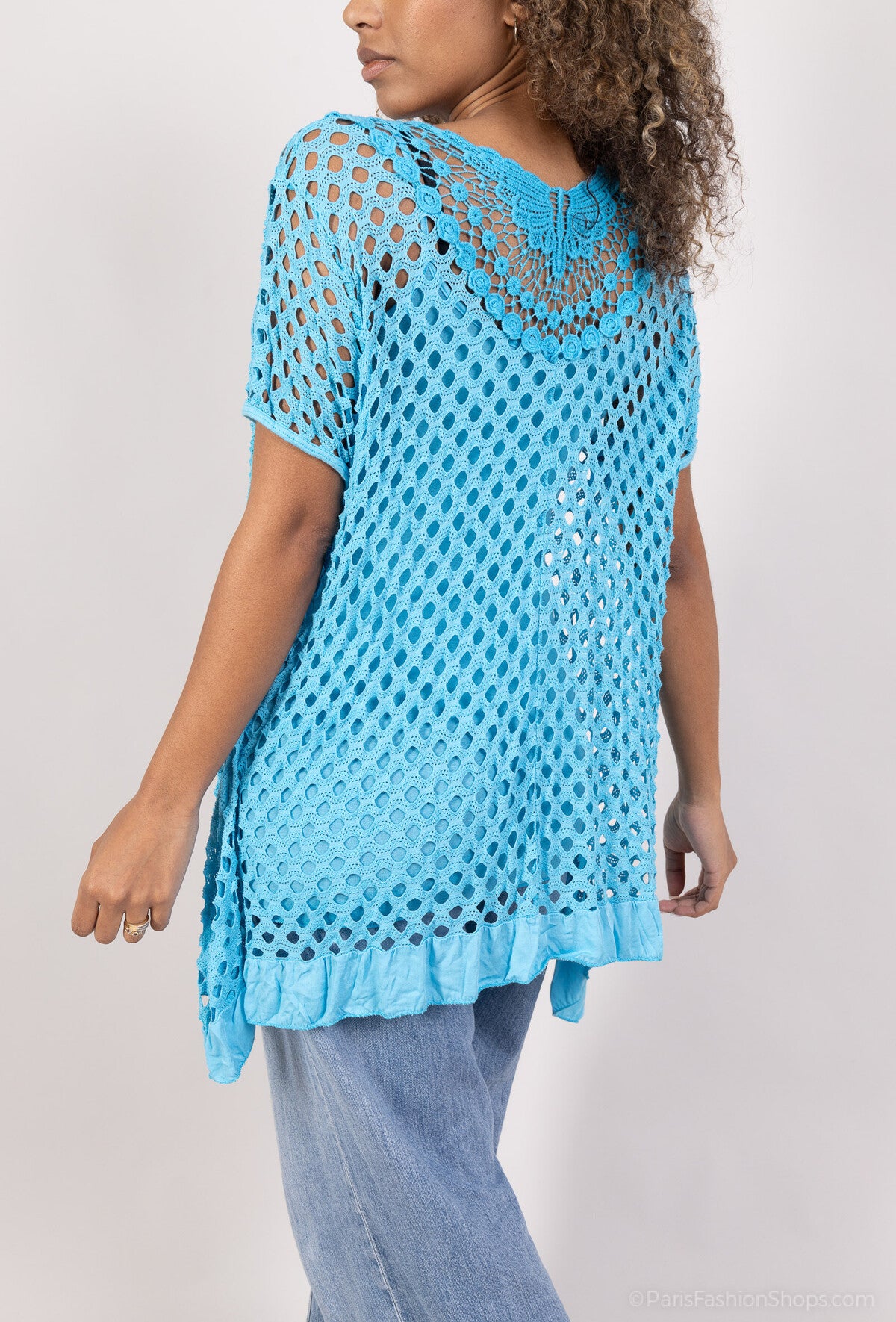 Viehkeä reikäneulos paita/tunika, sivuille pitenevä malli. Niskassa kaunis pitsikuviointi. Sisältyy erillinen ohut olkaiminen alustoppi.