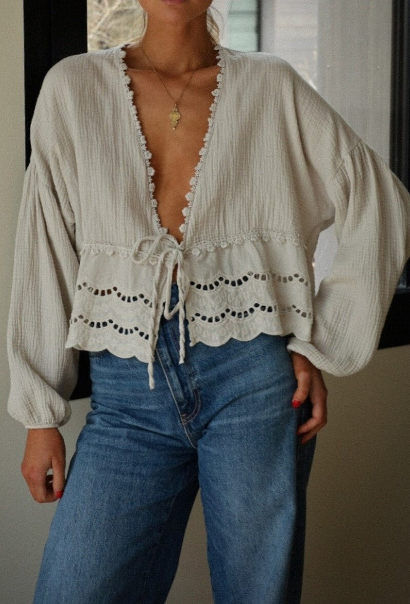 Mukavan rento pusero/jakku kauniilla pitsisomisteella. Solmimisnyörit edessä.
