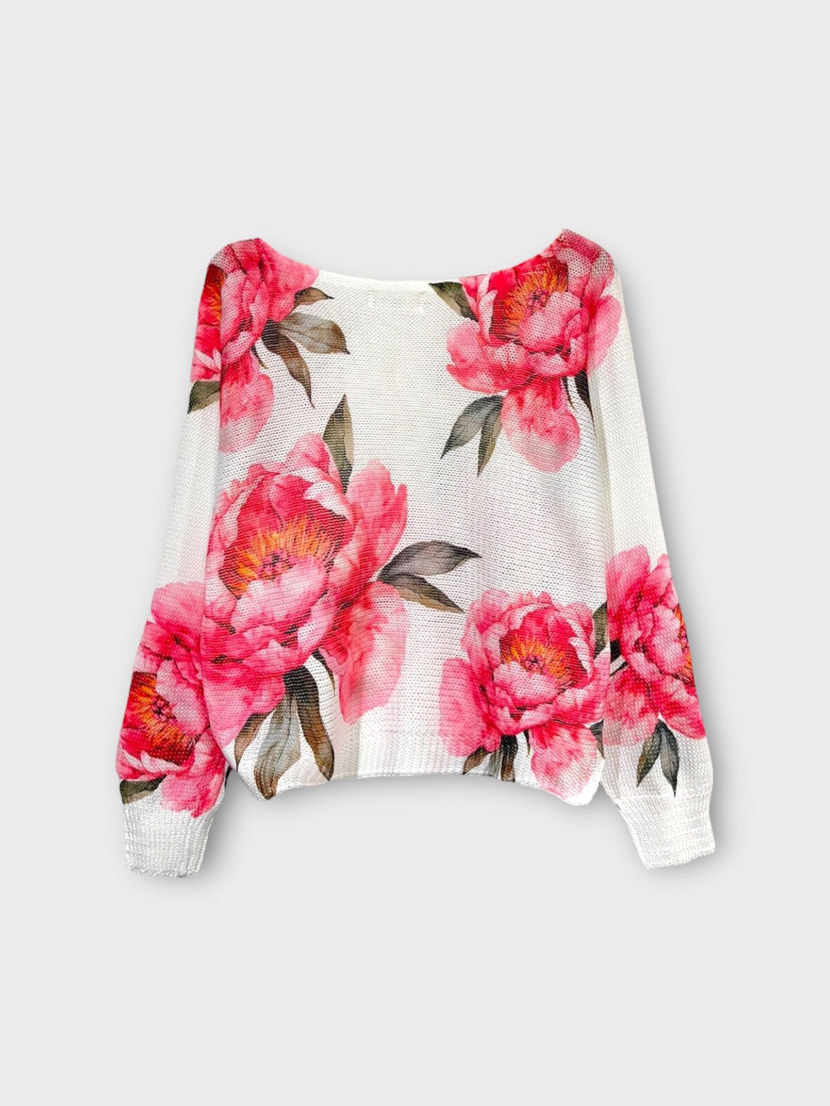 Tämä kaunis, ohut neulepusero hurmaa upealla suurikukkaisella kuosillaan! Valkoinen pohjaväri ja heleä vaaleanpunaiset kukat tuovat keäväistä raikkautta ja romanttista ilmettä pukeutumiseen. Kevyt ja hengittävä neulos tekee puserosta ihanteellisen viileämpiin kesäpäiviin tai kerrospukeutumiseen ympäri vuoden.
