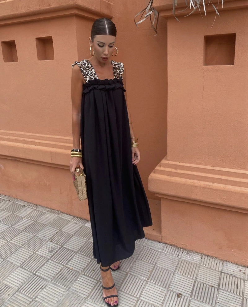 Kiva leopardi olkaiminen viskoosimekko, olkaimissa joustava kuminauha.