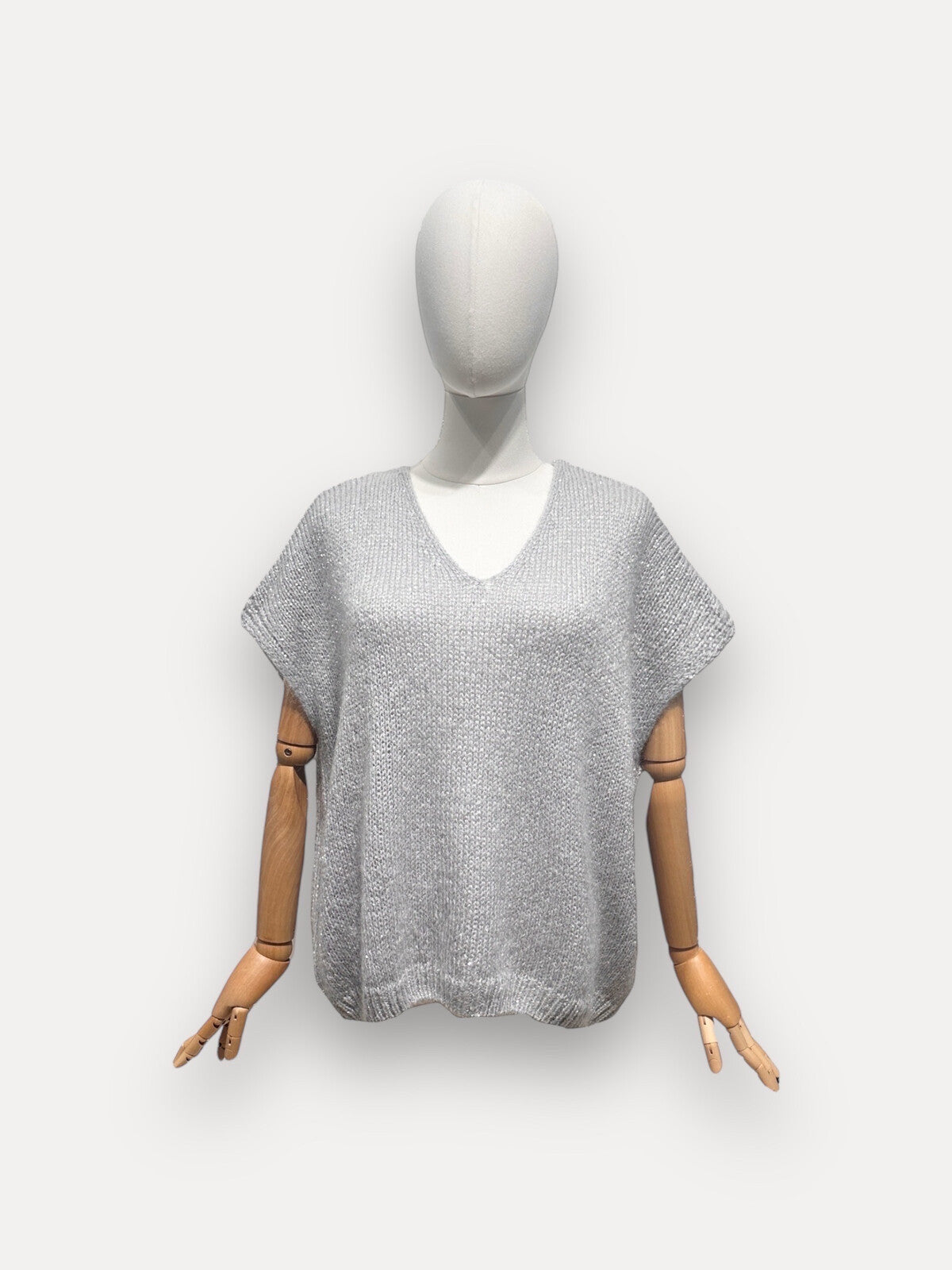 Hopeanharmaa lyhythihainen paljetein koristeltu V-aukkoinen neulepusero -