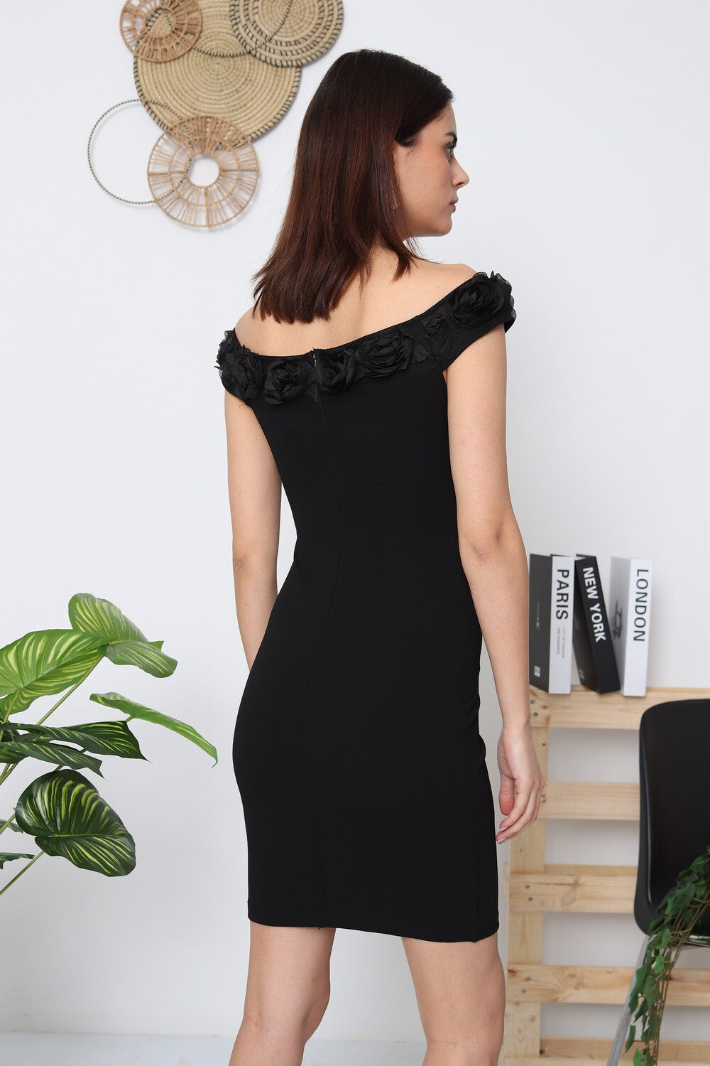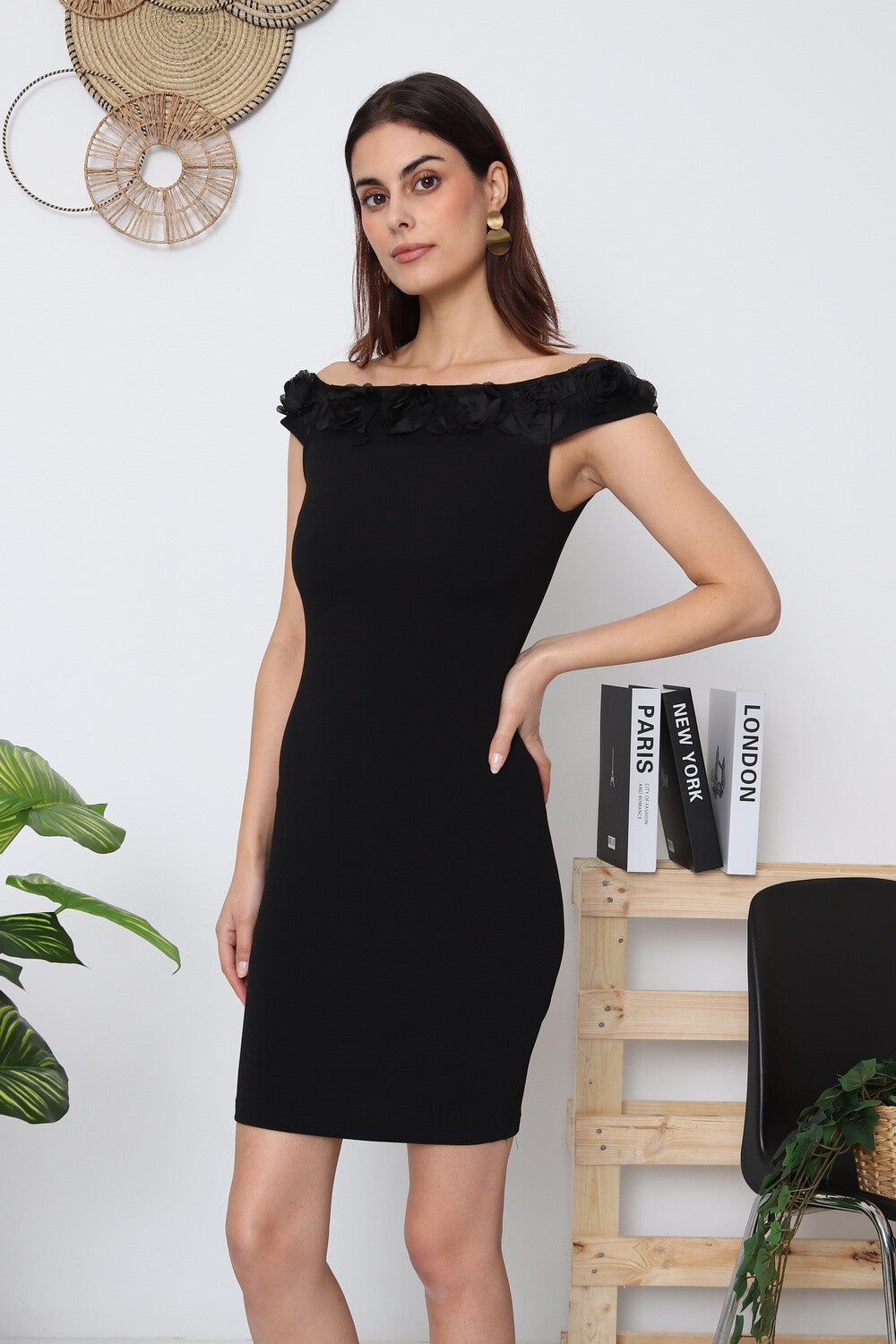 Upea, erittäin tyylikäs pikkumusta, kaunis pääntie koristeltu herkillä mustilla kukilla. Napakahkoa hieman venyvää materiaalia.