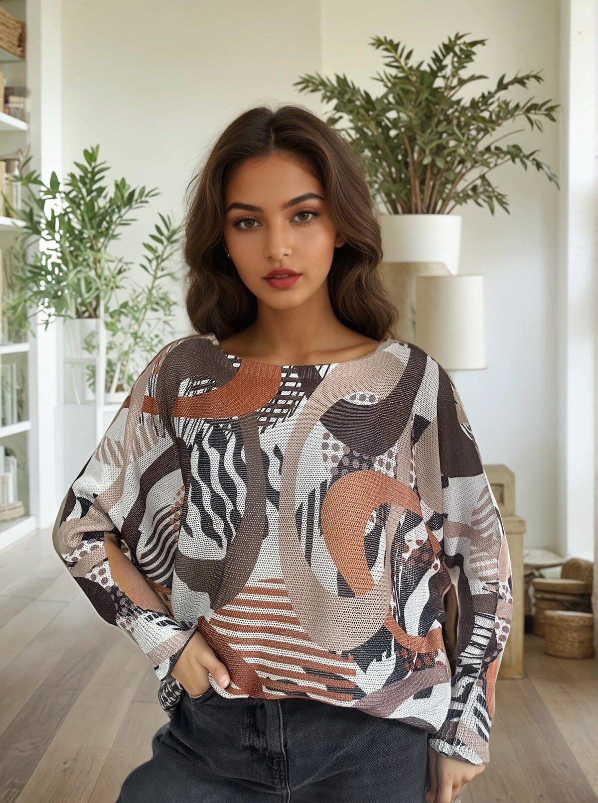 Neulepusero, jossa pyöreä pääntie ja pitkät lepakkohihat ja printti. Malli on 165 cm pitkä. Puseron pituus on 61 cm ja rinnanympärys 112 cm. Sopii kokoille 36-44.
