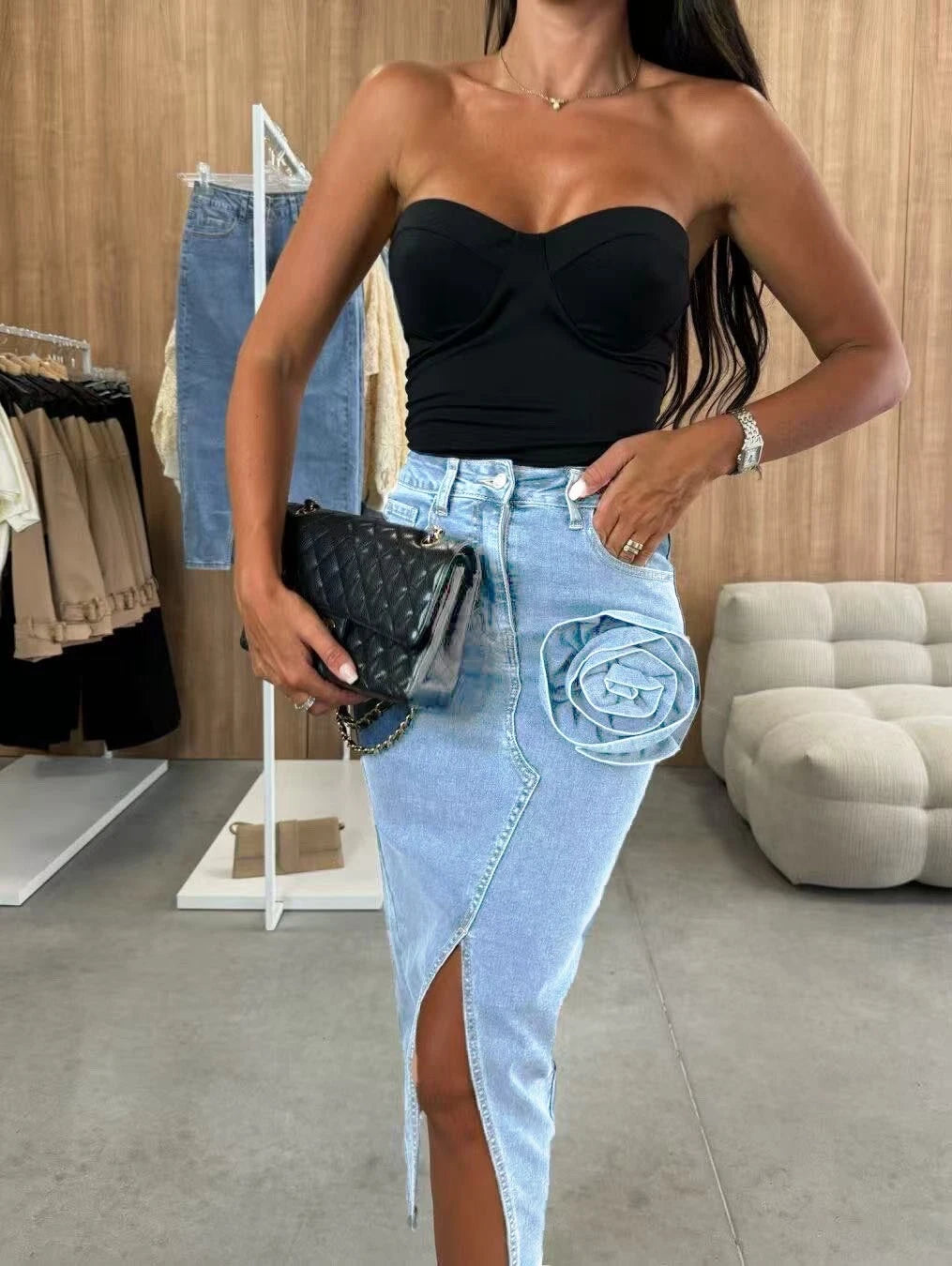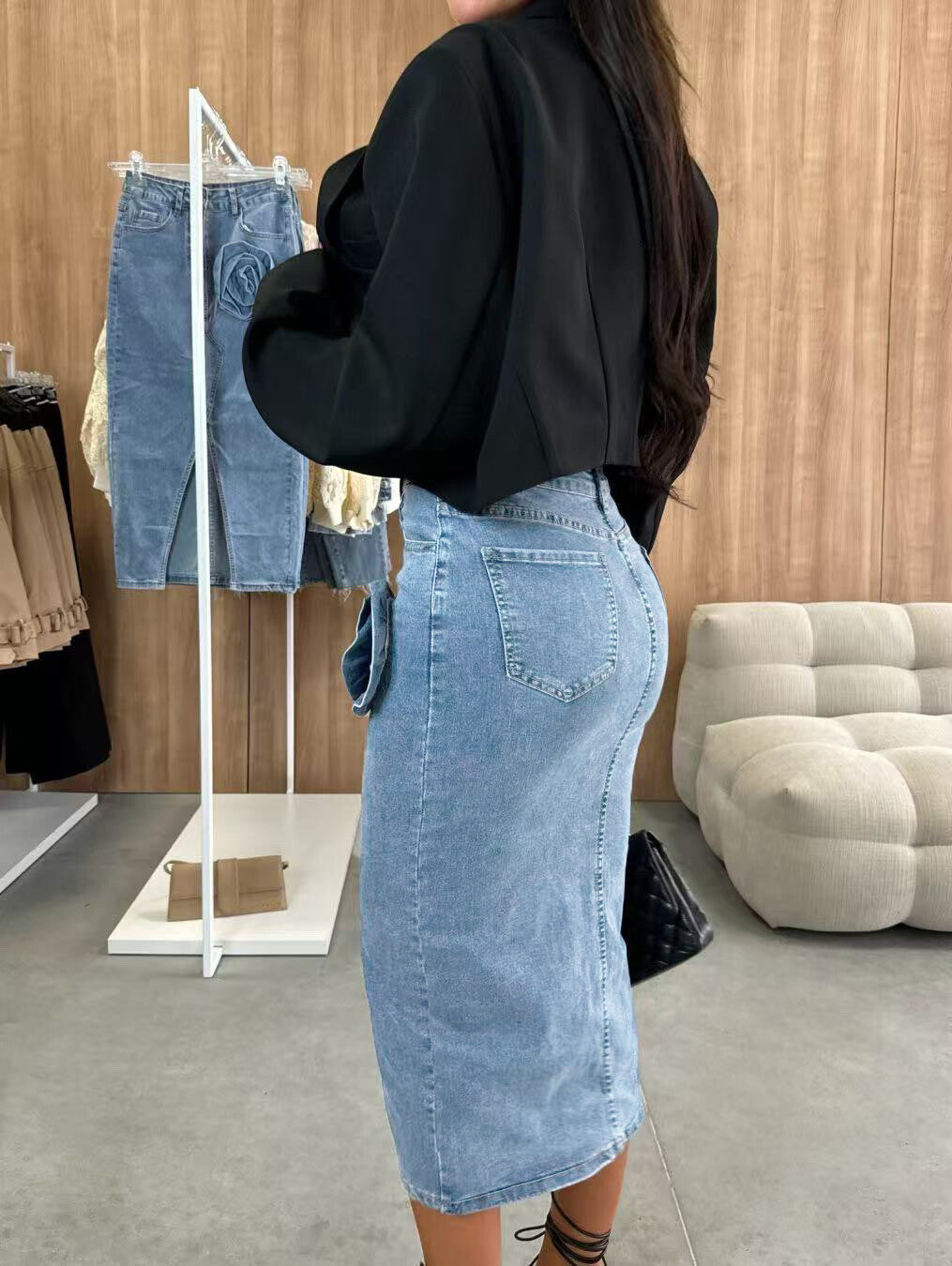 Upea sääripituinen farkkuhame näyttävällä ruusu yksityiskohdalla.