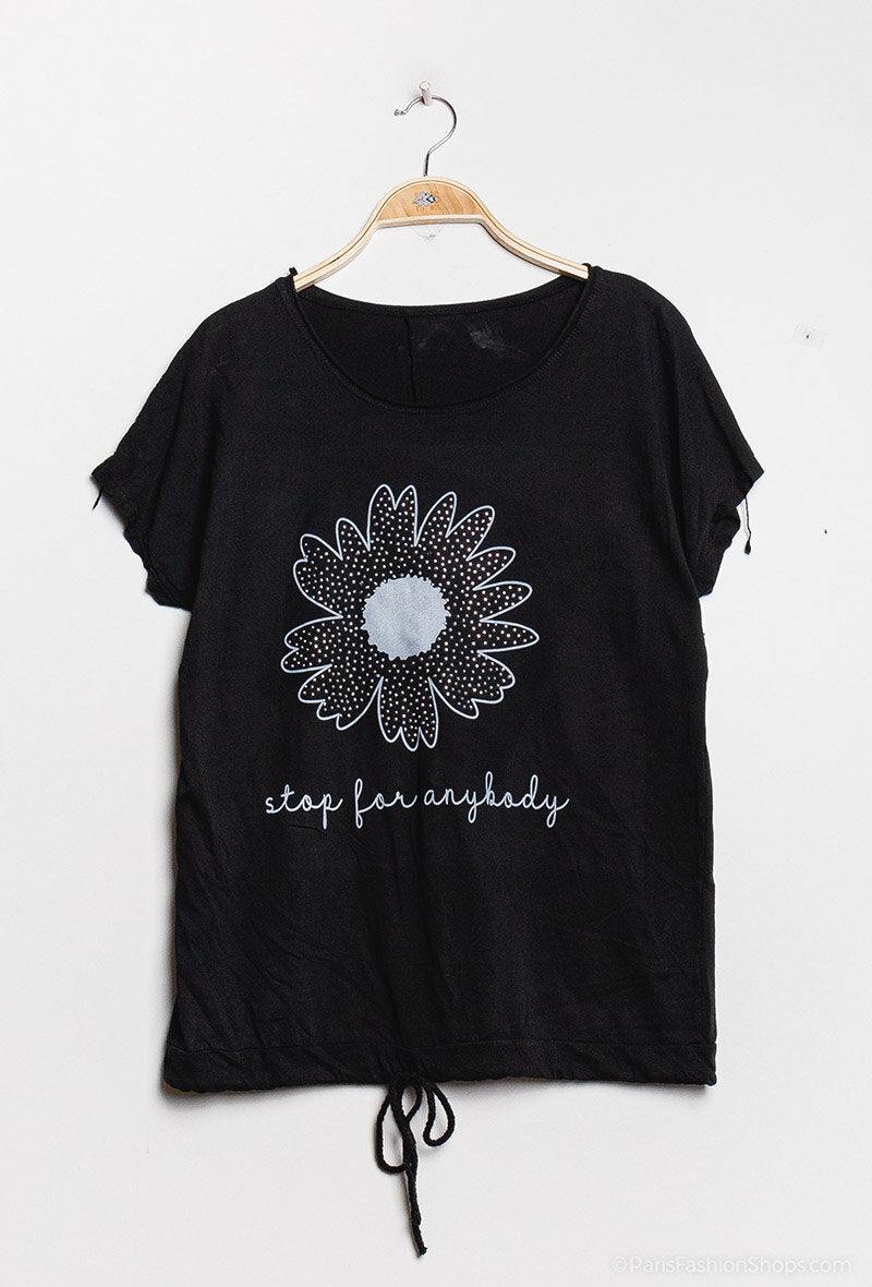 Kevyt ja pehmeä T-paita, jossa yhdityvät rentous ja ripaus naisellista kimallusta. Etupuolta koristaa strassiyksityiskohdilla viimeistelty kukkakuvio ja printtiteksti. Helmassa kiristysnyöri kivana yksityiskohtana.Kiva valinta kesähameen tai farkkujen pariksi!